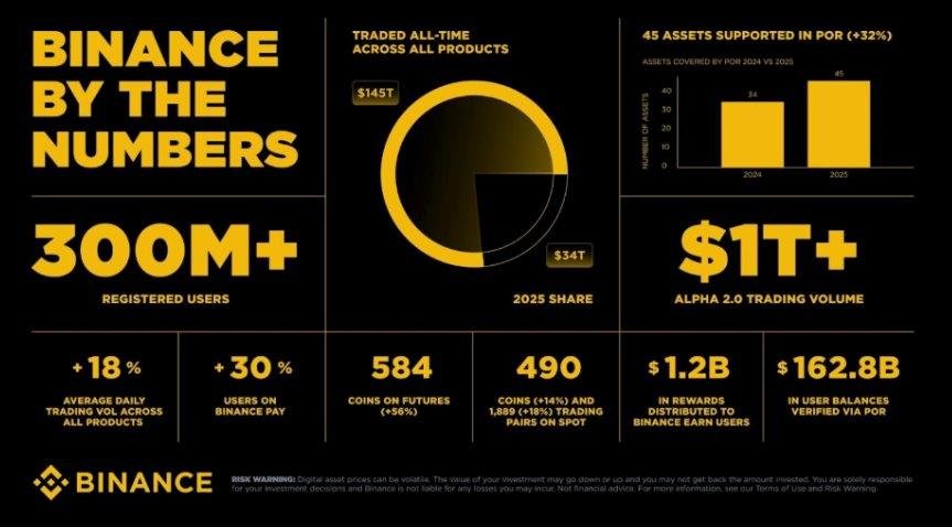 La adopción también creció. En 2025, el volumen de fiat y P2P creció un 38%; los usuarios de Binance Pay aumentaron un 30% anual, y la aceptación creció masivamente a más de 20 millones de comercios. En toda su línea de productos, Binance Earn distribuyó 1.2 mil millones de dólares en recompensas a los usuarios durante 2025.