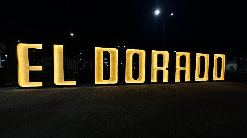 Este icónico aviso fue instalado originalmente el 28 de octubre de 1959 debajo de la torre de control donde permaneció por décadas como emblema visual del aeropuerto. El nombre del Aeropuerto Internacional El Dorado evoca la legendaria ciudad de oro que inspiró a los conquistadores españoles, basada en los rituales de la tribu Muisca en la Laguna de Guatavita. Inaugurado en 1959 en reemplazo del Aeródromo de Techo, su nombre simboliza la riqueza y el valor asociados con la región.
