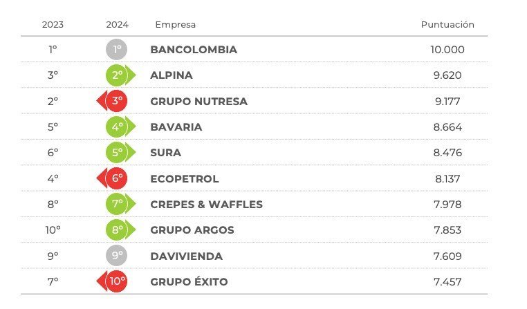 Grupo Nutresa, pasa del segundo al tercer puesto. Bavaria, escala una posición, pasando del quinto al cuarto lugar. Sura, pasa del sexto al quinto puesto. Ecopetrol, pasa del cuarto al sexto lugar. Crepes & Wafles, escala del octavo al séptimo puesto. Grupo Argos, sube dos posiciones, pasando del décimo al octavo lugar. Davivienda, continua en el noveno puesto. Grupo Éxito, pasa del séptimo al décimo lugar.