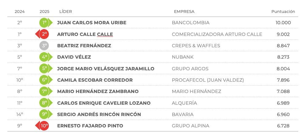 Arturo Calle Calle de Comercializadora Arturo Calle, pasa al 2º puesto; Beatriz Fernández de Crepes & Waffles, se mantiene en el 3º lugar; David Vélez, de Nubank,escala del 5º al 4º puesto; Jorge Mario Velásquez Jaramillo, del Grupo Argos, escala del 7ºal 5º puesto; Camila Escobar Corredor, de Procafecol (Juan Valdez), asciende cuatro lugares pasando del puesto 10º al 6º lugar; Mario Hernández Zambrano, de Mario Hernández, pasa del 8º al 7º puesto; Carlos Enrique Cavelier Lozano, de Alquería, escala del puesto 11º al 8º lugar; Sergio Andrés Rincón Rincón, de Bavaria, escala cinco posiciones pasando del puesto 14º al 9º y Ernesto Fajardo Pinto, de Alpina,pasa del del 9º al 10º lugar.