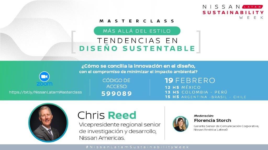 - «Más allá del estilo: tendencias en diseño sustentable”: masterclass virtual liderada por Chris Reed, vicepresidente senior de investigación y desarrollo de Nissan Américas, para repensar cómo el diseño sustentable y el desempeño de un producto pueden ser complementarios. Tendrá lugar el jueves 20 de febrero a la 1:00 p.m. hora CO. Webinar gratuito en vivo en https://bit.ly/NissanLatamMasterclass (código de acceso Zoom 599089).